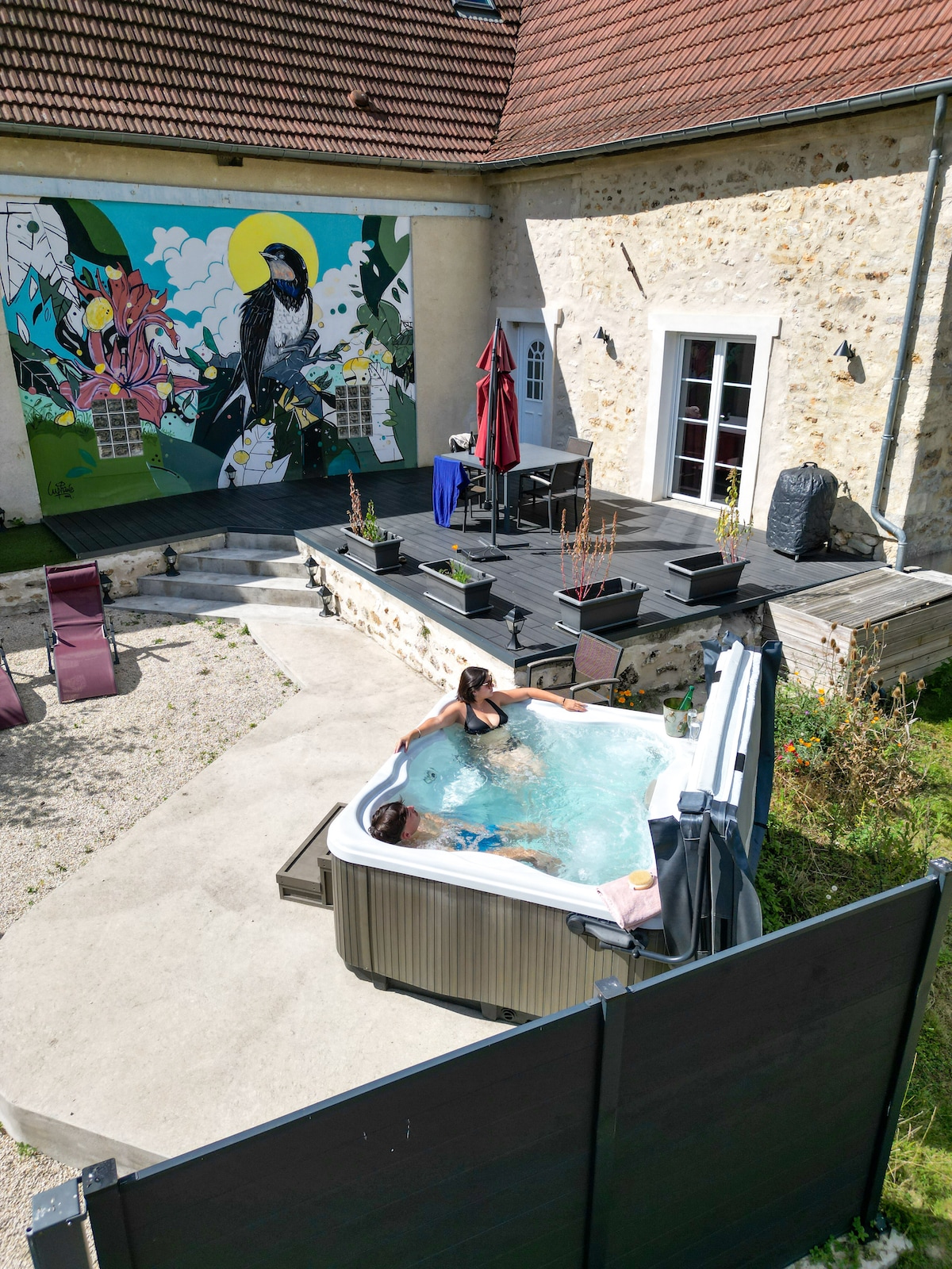 Maison La Bulle 250m2 berendezett íz, az Ön örömére és a menekülés! Található pezsgő, a Marne, 20 percre Reims. Jelenleg 4 tematikus szoba Netflix csatlakoztatott TV-vel, beleértve 3 légkondicionált, saját fürdőszobával: ART DECO TERMÉSZETTUDOMÁNYI terem Szoba FEHÉR szoba FEHÉR LOFTSZOBA (otthoni melléképület) A vendégek rendelkezésére áll egy 30 fokos fűtött fedett medence és egy 38 fokos jacuzzi, amely közvetlenül elérhető a nappaliból és az udvarról.