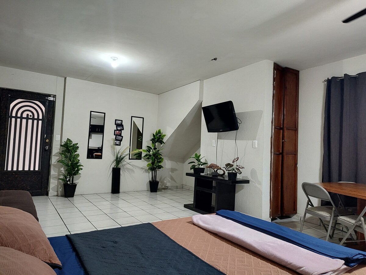 Departamento entero, en recámara tiene cama King Size y 2 sofá cama, aire acondicionado frio/calor, TV, closet y cajoneras. Además, tiene exclusivamente para ti: sala con 2 sofá cama, baño completo, barra comedor, cocina (con refri, estufa, micro ondas, horno, cafetera, nutribullet, sartenes, platos, etc.) Wi-fi rápido de 80MB, TV en sala.