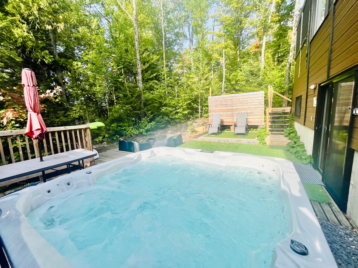 CITQ # 308962 insta:@lechaletcozy Kiváló faház gyógyfürdővel, mindössze 15 percre a St-Sauveur előtt, egy hatalmas, meghitt és 100 000 négyzetméteres erdős privát telken.! Legfeljebb 6 személy elszállásolására alkalmas! Az emeleten 2 zárt hálószoba (+1 zuhanyzó) és egy kanapéágy az alagsorban. Élelmiszerboltok, létesítmények és számos érdekes étterem közelében! A faház minden szükséges felszereléssel fel van szerelve ahhoz, hogy egy felejthetetlen pillanatot tölts a családdal vagy a barátokkal, nyáron vagy télen!