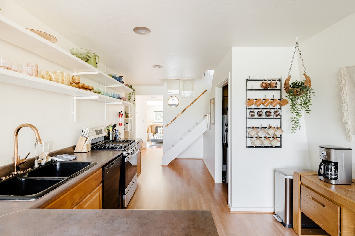 This tri-level home has a bright open floor plan with soaring ceilings and breathtaking views of the canyon. All bedrooms have king beds. Enjoy starlight or sunrise views facing south! Two complete kitchens allows for two families to share the home and meals together or for private family time. Three outside decks allow for multiple viewing spots. Tons of fruit trees (fig, plum, cherry, apple, pear, apricot, peach) provide a bounty of fruit and shade. Only a 2 minute walk down to the creek!