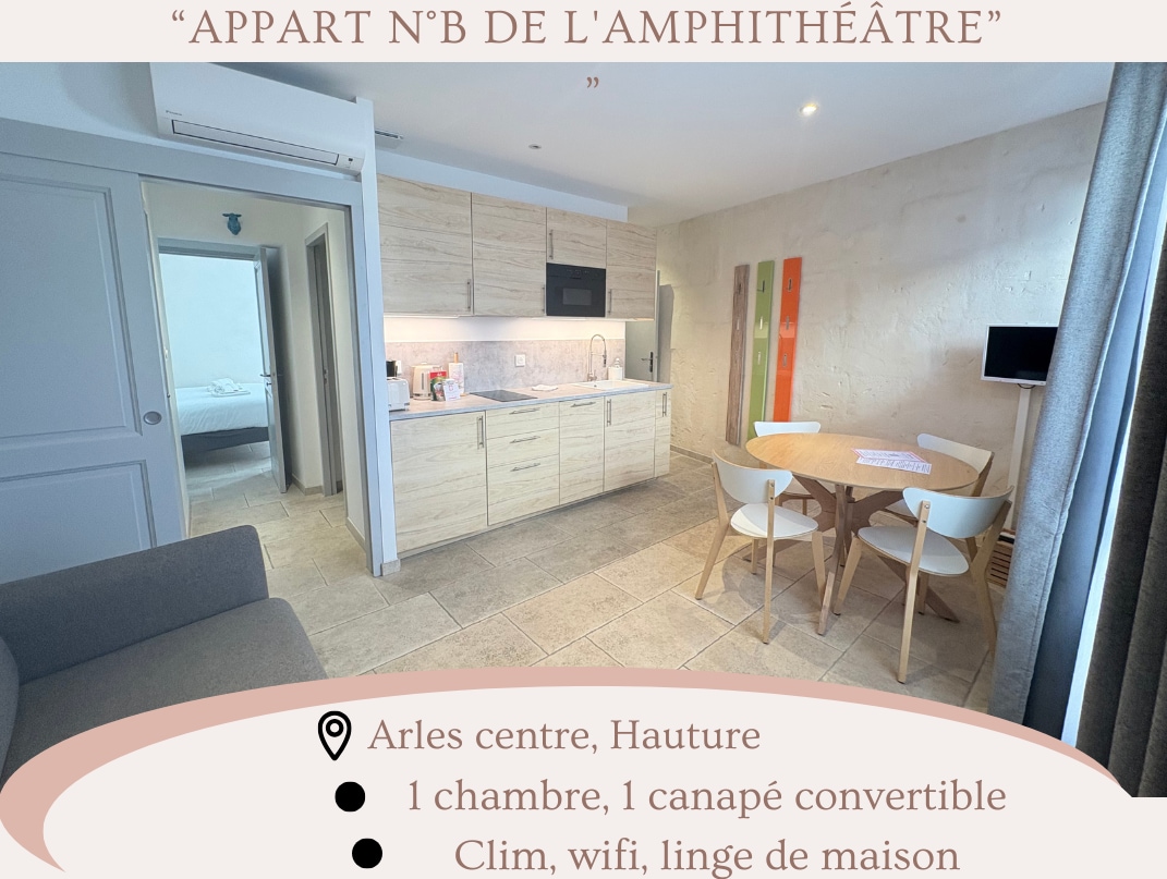 A 19. századi házban, néhány méterre a római amfiteátrum, a lakás kínál csodálatos kilátás nyílik a Hotel de Donines. A ház 2. emeletén található. A 3. emeleten található tetőről panorámás kilátás nyílik a Rhône-ra és az óvárosra. A lakás nemrég újították fel, ez olyan, mint az új. Ez kínálja a kényelmet, a dekoráció keverő design, fotók és a báj.