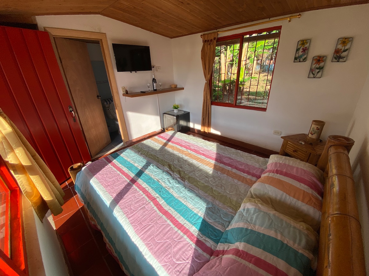 Habitación amplia en segundo piso con balcón y hermosa vista a los guaduales. Ideal para parejas o familias pequeñas que buscan confort y naturaleza. A solo 15 minutos del Parque del Café, ofrece piscina, jacuzzi y amplias zonas verdes. Disfruta de nuestro sendero ecológico con río privado, perfecto para caminar, relajarte y escuchar el canto de las aves. Tranquilidad, aire puro, y paisaje y cultura cafetera en un solo lugar