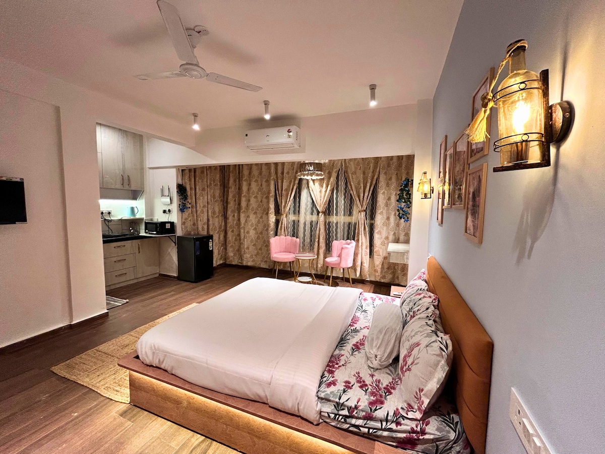 Modern Boho Apartment | Minutes from North Goa's Beaches.A cozy, fully furnished 1BHK retreat on ground floor perfect for couples, friends, or small families. Highlights: - Stylish boho interiors with a warm vibe - AC in bedroom & living room for comfort - Smart TV + High-speed WiFi - Equipped kitchen with RO water, cooktop, fridge & washing machine - Shared swimming pool (9 AM–6 PM | swimwear mandatory - On-site gym available at INR 200/-per person per day - 24/7 security - Free Parking