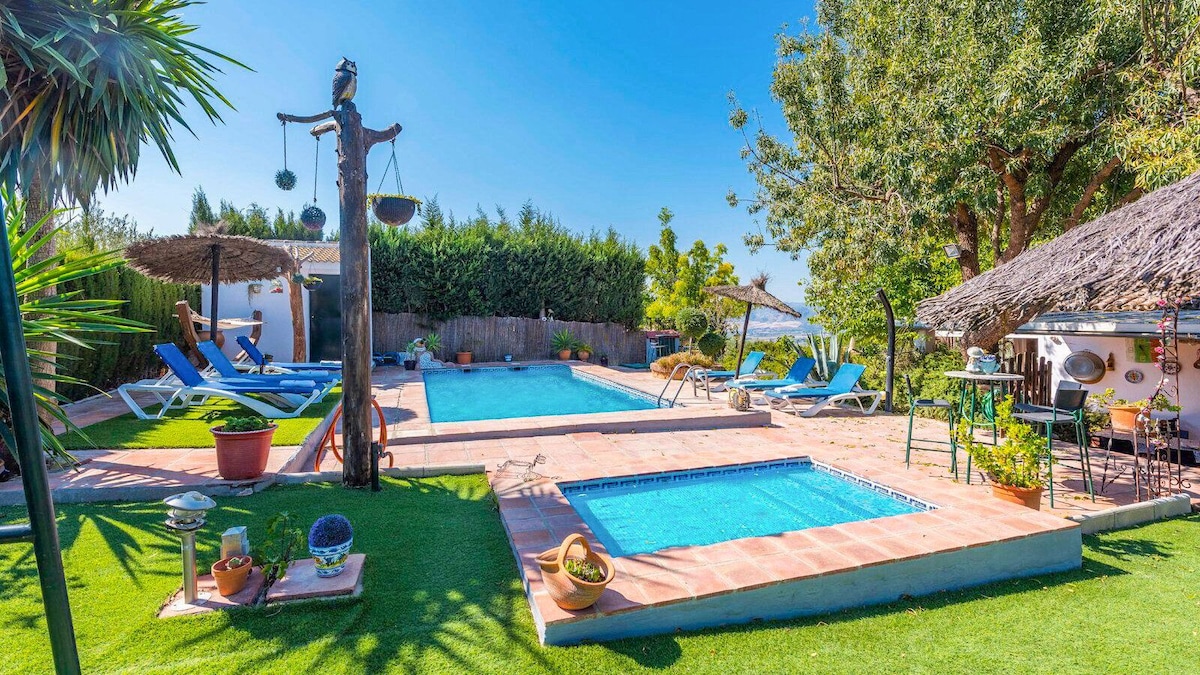 Lenyűgöző villa mindössze 1 km-re Rondától, a lehető legnagyobb részletességgel a 10 000 négyzetméteres területen. Merülj el egy egyedi vidéki környezetben, ahonnan kiváltságos kilátás nyílik a városra, pihenhetsz a kertjeiben, a szoláriumban, a grillezőben és a saját medencében. Kényelmesen átalakított és a legapróbb részletekig díszített otthonnal rendelkezik: eredeti Rondeño stílusú bútorok, mennyezeti ventilátorok, teljes konyha, esőzuhanyzó, légkondicionálás...