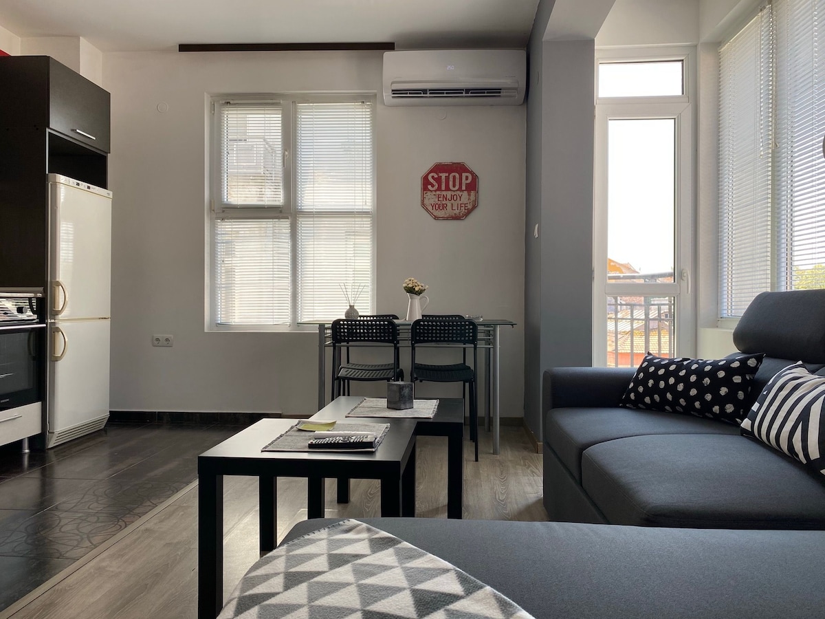 Üdvözöllek a lakásomban. Újonnan felújított, minden kényelmi szolgáltatással Plovdiv tetején. Szó szerint a Fő sétálóutcán található, 2-3 perc sétára az óvárostól és a csapdától (Kapana), valamint számos üzlettől és étteremtől. Csodálatos napfelkeltét és kilátást élvezhetsz a városra, a dombokra és az óvárosra, miközben a reggeli kávédat iszod, vagy csak pihensz a 8. emeleti erkélyen. A lakás csendes, teljesen berendezett és felszerelt, IPTV, gyors Wi-Fi. Alkalmas üzleti utazásokhoz és kikapcsolódáshoz.