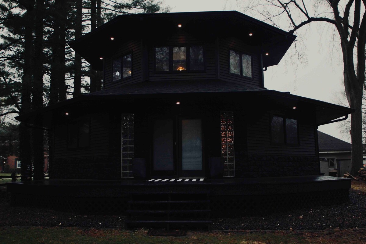 Üdvözlünk a vírusos Airbnb-szálláshelyünkön, amelyet lenyűgöző, modern fekete külsejéről és elegáns belső teréről ünnepeltek! Az Illinois állambeli Lincolnban található egyedi nyolcszögletű otthon nyugodt és békés menedéket kínál. Az 1800-as évek ikonikus nyolcszögletű dizájnját átölelve nincsenek négyzet alakú szobák, harmonikus és egyedi áramlást teremtve. Ez a modern mestermű, amely tökéletes a kikapcsolódáshoz vagy a helyi látványosságok felfedezéséhez, felejthetetlen emlékekkel garantálja a felejthetetlen tartózkodást.