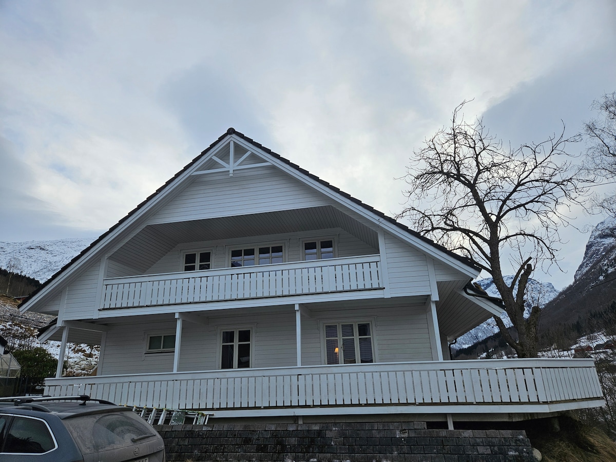 4 soverom og stor stue. Landlig og privat hage med stor terrasse, liten elv og vidunderlig utsikt! Du bor midt i et ski eldorado på vinteren: 30 min til Filefjell skiheiser, 40 min til Hemsedal skiheiser. Sogndal 1 time. Aurland og Flåm 30 min. Huset ligger langs elven i den grønne dalen Lærdal. Huset ligger på vår eplegård, dere er velkommen til smaksprøve av epler, saft og cider! Gå fine rolige turer langs elven, eller 1000 meter høye fjell med mange flotte turer!