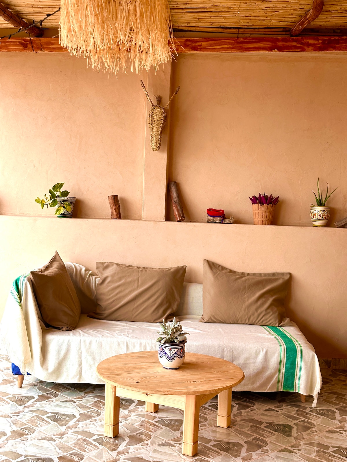 Tigminont egy fiatal marokkói szörfös birtokolja, amely a Taghazout közelében található bájos Banana Village-ben található. Ez a hely egy rejtett gyöngyszem, amely békés és exkluzív légkört kínál, mindössze 5 perc sétára a strandtól. Kivételes munkát végeztek a felújításával, hogy belekóstolj ebbe az autentikus marokkói hangulatba. És tudod mit? Olyan világhírű szörfös helyek vesznek majd körül, mint a Banana Point vagy az Anchor Point. De ez nem minden Tigminon is kényelmesen közel van Paradise Valley-hez