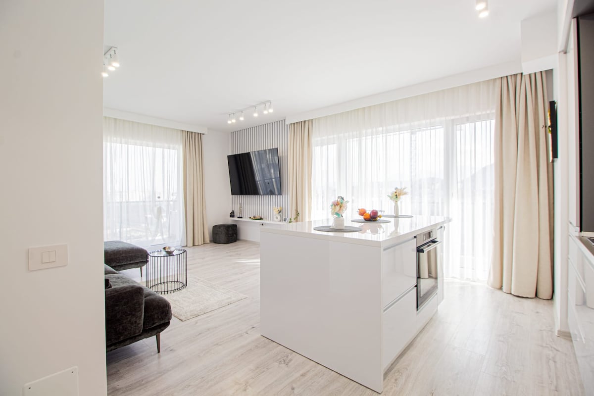 A uniquely and carefully designed, this apartment perfectly combines coziness with stunning Scandinavian accents. Situated in a new residential neighborhood, we go above and beyond to ensure a unique experience for our guests. Our home can accommodate up to 4 people and has its parking lot. The standout feature of this penthouse is the spacious terrace with a jacuzzi and a panoramic view over the mountains, being ideal for couples, business travelers, solo adventurers, or families (with kids).