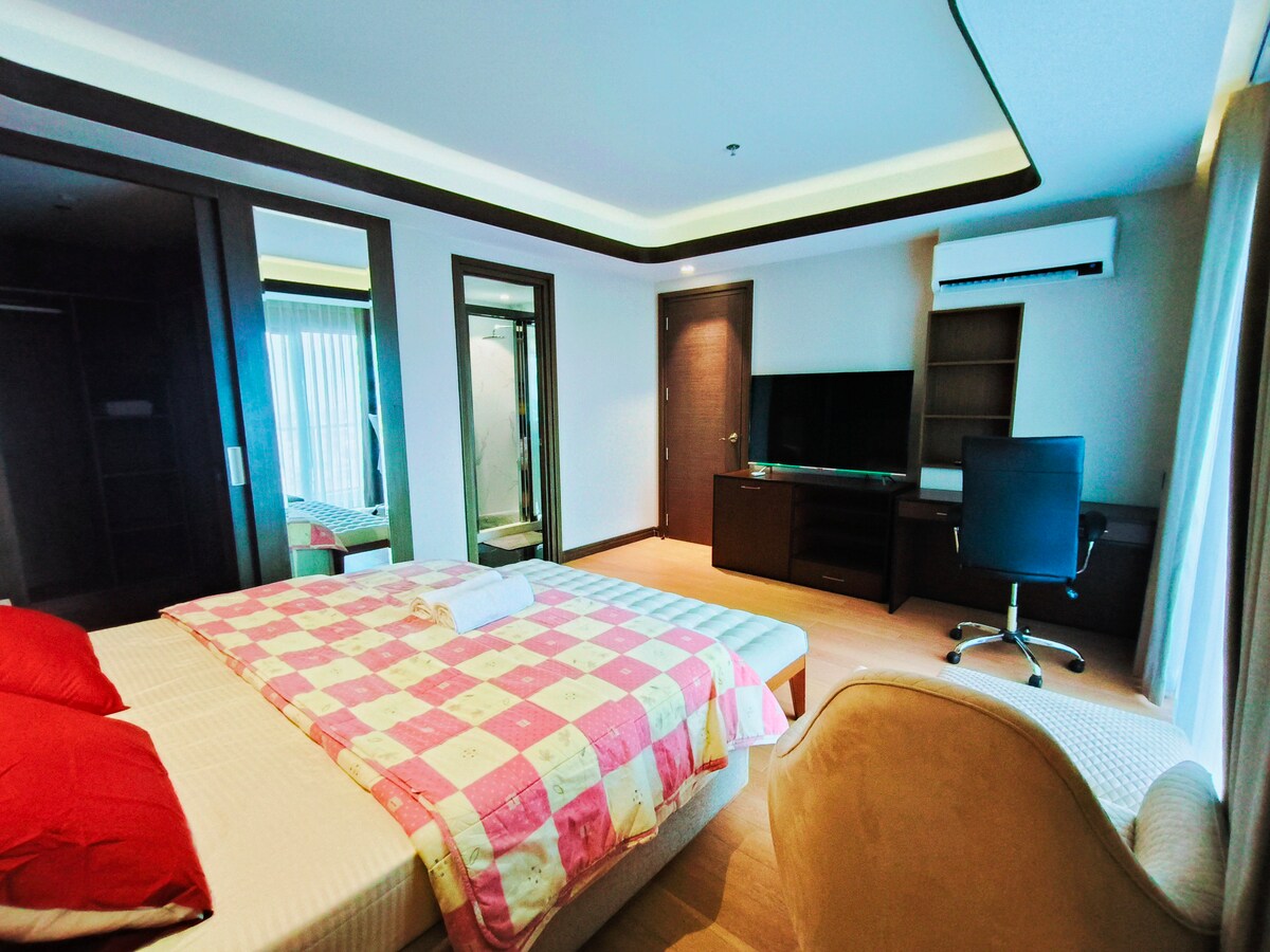 Ez a One Euphoria legfényűzőbb és legtágasabb egysége. 1 hálószoba, öltöző, tágas nappali, ír konyha és terasz. Két tévé van felszerelve a hálószobában és a nappaliban Az épület tetején biztonságosan használhatsz különböző létesítményeket, például edzőtermet, úszómedencét és bárt. Nagyon közel a Red Streethez (Walking Street) és a Kaszinóhoz.
