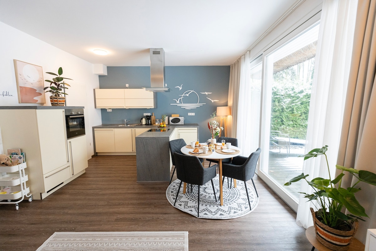Üdvözlünk a Residenz am kleinen Meerben, Bad Zwischenahnban. A „Wasser” házunkban minden megvan, amire szükséged lehet a kellemes időtöltéshez: → 4 hálószoba kényelmes king és queen méretű ágyakkal → 2 nagy terasz és 1 tóra néző erkély → Nagy penthouse tóparti kilátással → Szauna a komplexumban → Parkoló közvetlenül a házban → 3 teljesen felszerelt konyha → 3 modern fürdőszoba → Munkaállomások/íróasztalok → Gyors Wi-Fi ☆„Egy igazi álom! Szép nyaraló, minden benne van.”