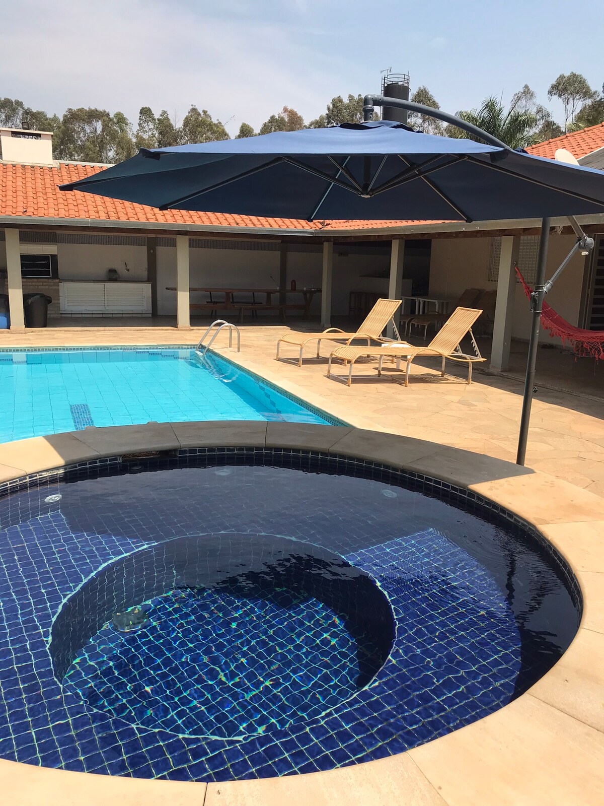 Tökéletes hely a kikapcsolódáshoz vagy a szórakozáshoz. • 1 hálószoba (1 franciaágy + 1 egyszemélyes ágy) • 2 fürdőszoba • Evőeszközökkel felszerelt konyha • Tűzhely, sütő, fagyasztó és hűtőszekrény • Tévé és Telão filmekhez vagy eseményekhez • Úszómedence vízeséssel • Grillezés • Wi-Fi • Asztalok és székek összejövetelekhez • Nagyszerű elhelyezkedés, közel a szupermarkethez és a pékséghez Bőséges szabadidős terület, körülbelül 200 m² -es területtel, amely ideális a pihenéshez vagy a kisebb ünnepségekhez.