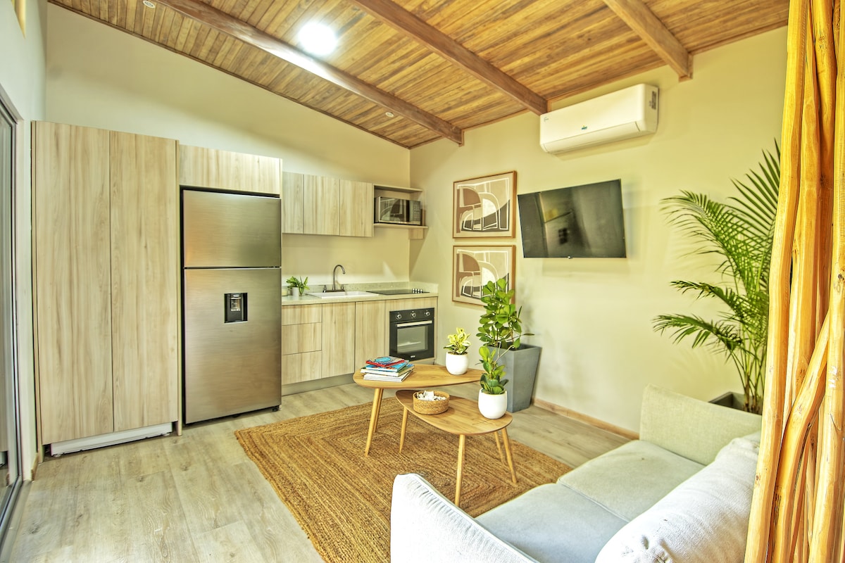 Desconecta de tus preocupaciones en este espacio moderno y tranquilo. Tiene todas las comodidades de un hogar, con mucho detalle para que te sientas como en casa. Cuenta con aire acondicionado en ambas habitaciones y espacio en común. Para tu seguridad y fácil ingreso las cerraduras son digitales. Ven a visitarnos y conoce todos los atractivos turísticos de Guanacaste que están a pocos kilómetros de nuestra ubicación.