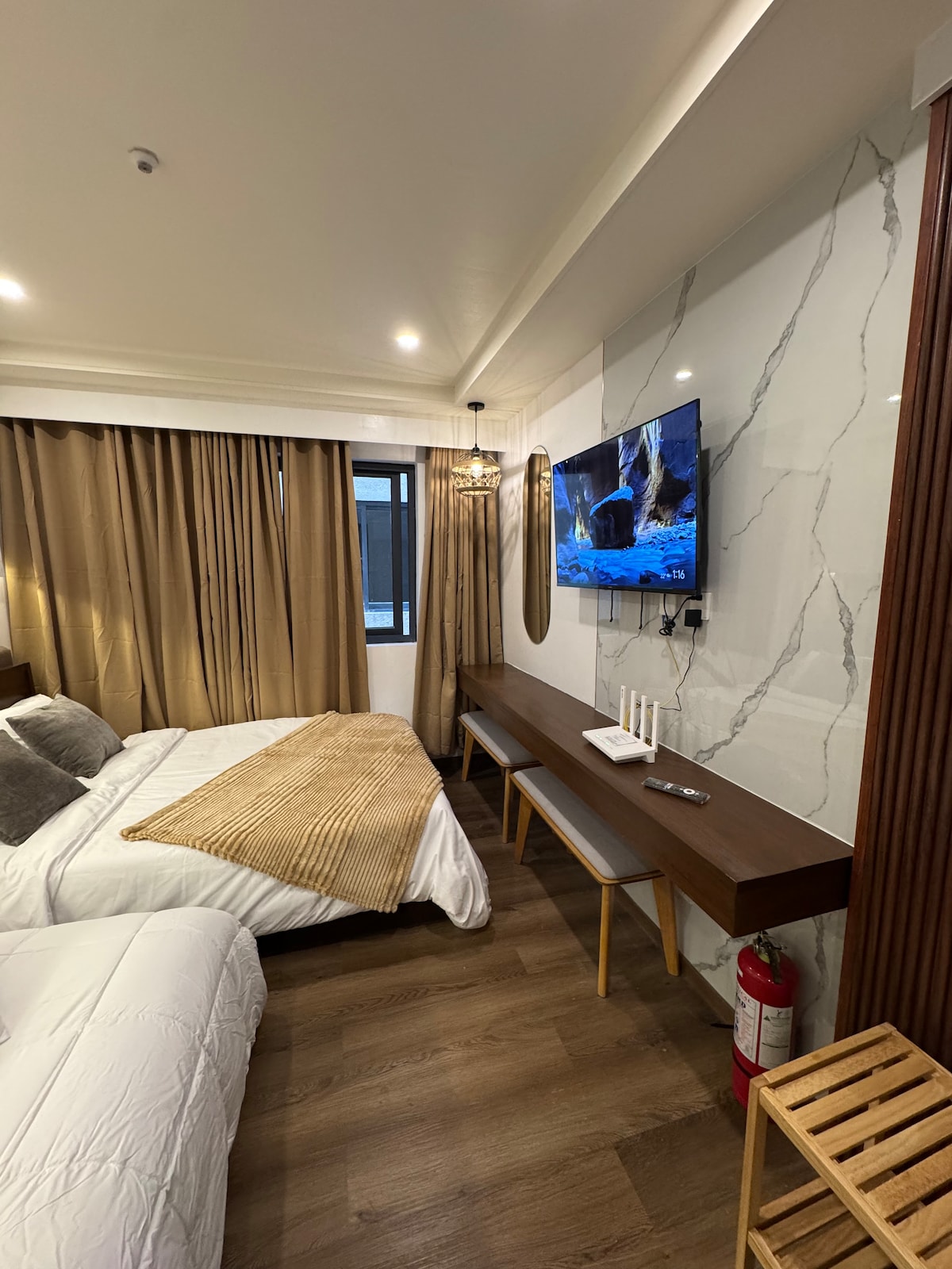 1.Upgraded/remodeled on Nov 10, 2024. New split type AIRCON was also installed. Conveneintly located in the heart of the city- few meters away from Session Road, Burnham, Night Market, Cathedral, Public Market, SM, bus terminal etc. 2. With WIFI and 42 inches samsung smart TV. 3. Savemore Supermarket at the Basement. 4. Mall, Resto,Watsons etc.. in the bldg. 5. Ref, Microwave, Water Heater, eletric fan, eating and cooking utensils, 6. Linens,towels and toiltries are provided.
