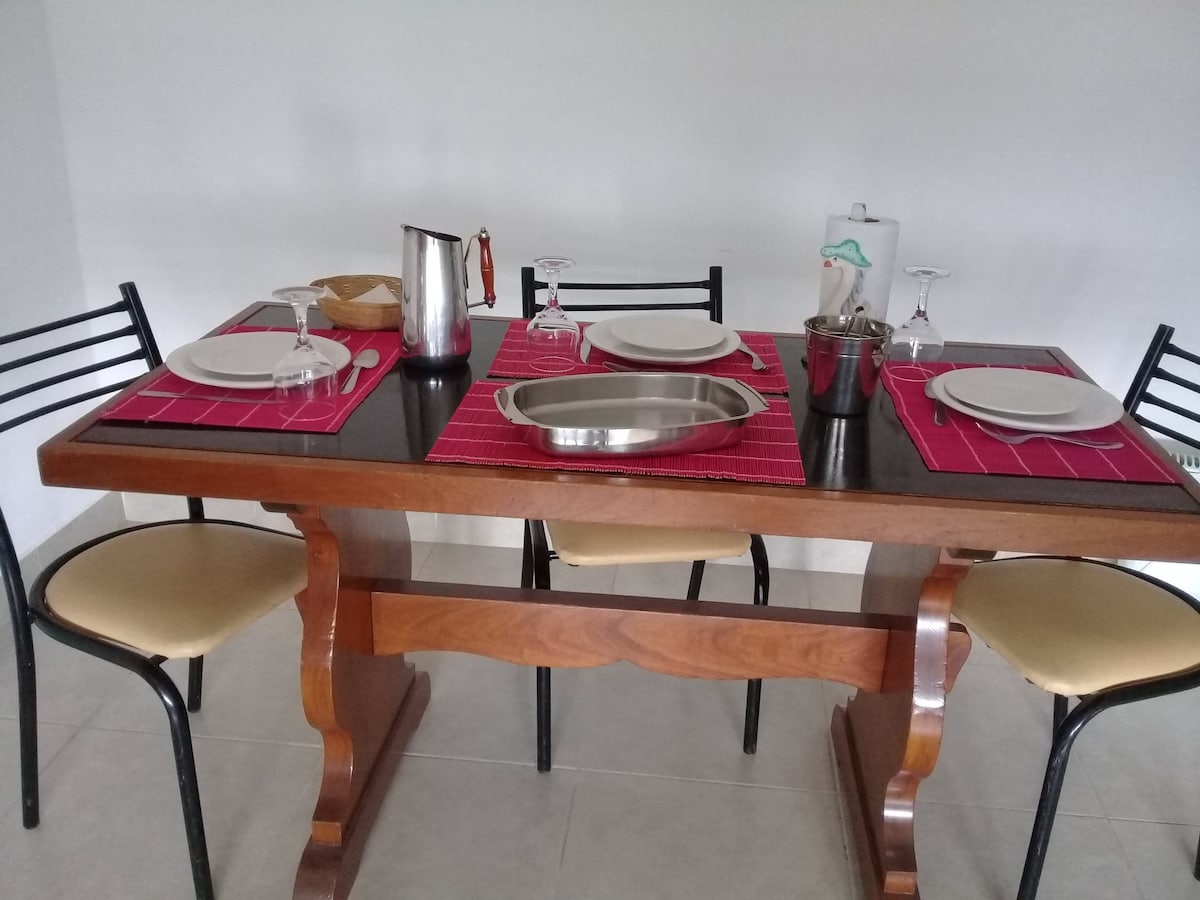 El dpto se encuentra en excelente ubicación, a solo 3 cuadras de Plaza principal y centro comercial. Está muy bien equipado y es confortable. Posee 2 camas, 1 cama de 2 plazas y 1 camas de 1 plaza. Cuenta con ropa de blanco sábanas, frazadas,b almohadas y toallas. Con AA frío calor y ventilador de piso( turbo) Es muy luminoso y con buena ventilación cruzada. Posee un pequeño balcón. El dpto esta en el 1er piso y el edificio tiene ascensor. y con cochera en el edificio.