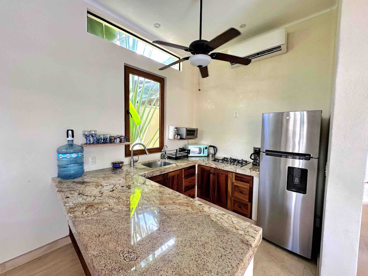 Just a short walk from the beach, Casita Rubia is our lower garden-level unit, offering a refreshed and tranquil escape in San Pancho. Recently updated with warm, modern touches, this bright one-bedroom casita sits below two new upper suites and overlooks a lush garden and shared pool. Enjoy the pool loungers or your private bistro set outside the king bedroom. A full kitchen, dining table, sofa bed, and fast Starlink WiFi await you—and pets are warmly welcomed!
