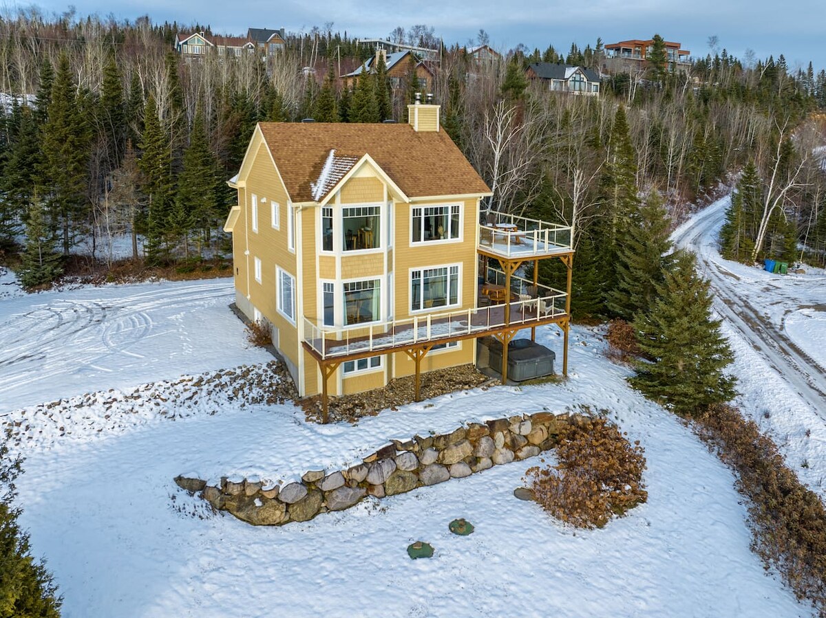 Villa avec piscine creusée situé entre fleuve et montagnes. Eskal, se démarque par son design épuré et sa grande fenestration. Entièrement équipée, la résidence possède 1 spa, 3 foyers, 3 chambres spacieuses avec salle de bain privée, 1 salle de jeux et sans oublier 1 piscine creusée chauffée avec vue sur le Fleuve St-Laurent ! Vous serez sans aucun doute charmé par les spectaculaires lever du soleil et le doux son de la rivière et des chutes à proximité. Capacité 6 adultes maximum et 4 enfants.