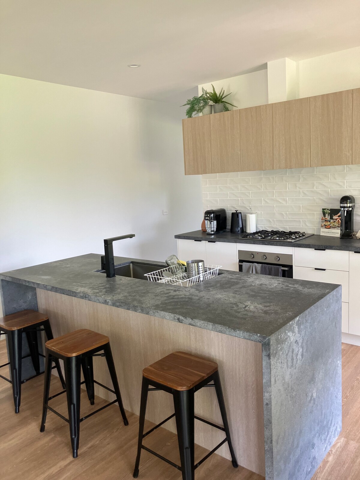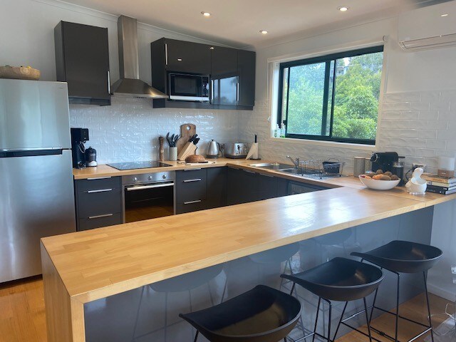 Beautiful upstairs Luxury Apartment, With spa bath and shower with a window to the sky! Modern full kitchen with stone benchtops, large fridge, hot plates, oven, & microwave. Master bedroom has a king bed with tv mounted on the wall, 2nd bedroom has a queen bed. 3 reverse cycle air conditioning/ heating in each apartment. Living area and both bedrooms have a unit. Front loader washing machine/dryer- European Laundry. Free Netflix. Have fun with the whole family at this stylish place.