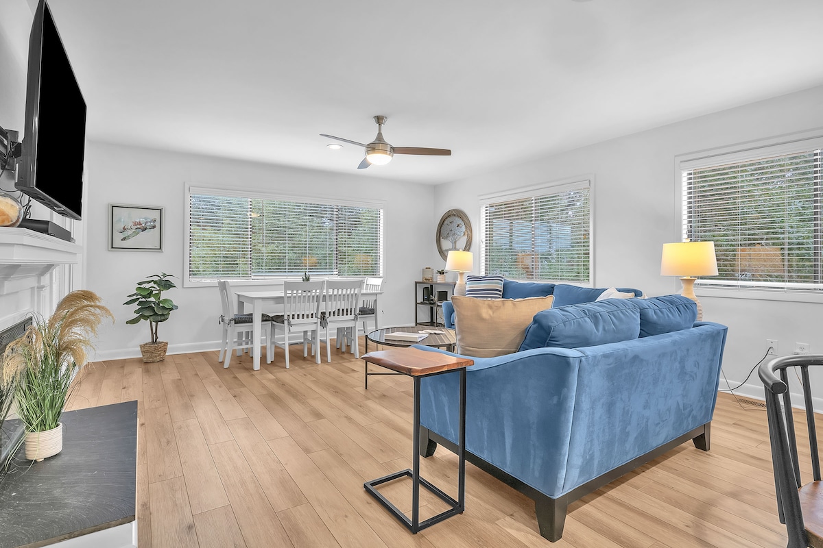 Relax in our cozy, modern home tucked in the woods of Cape Fear Station. Kayak from our private community dock, go crabbing, swim at either of the club pools or take a quick golf cart ride to nearby East Beach! Stylish & comfortable, this home has been fully renovated and outfitted with family-friendly, thoughtful amenities to elevate your vacation and help you pack a little lighter! Have a question about our home or need something important for your stay? Let me know, I'd love to help!