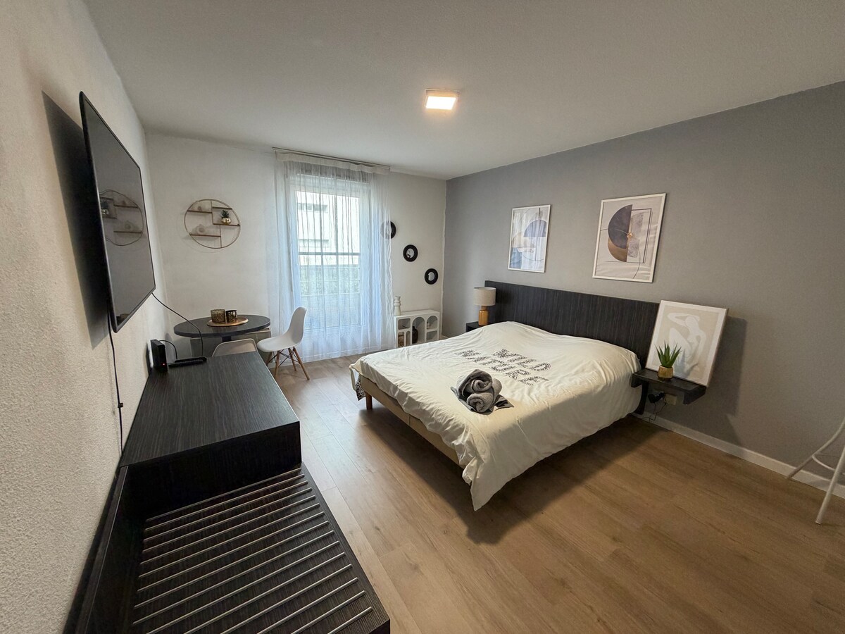 Üdvözlünk a toulouse-i menedékünkben, amelyet fényben fürödtünk, és amelyet mi újítottunk fel. A Les Argoulets békés zöldövezetében található, egy rövid sétára a metrótól, és kevesebb mint 10 perc alatt eléred a város szívét. A nappaliban található két barátságos hálószoba kétszemélyes ággyal és egy kanapéággyal kényelmes helyet biztosít 4-6 fő számára. Minden reggel hagyd, hogy elbűvöljön a napfelkelte az erkélyről. Felár nélkül rendelkezésre áll íróasztal és babaágy