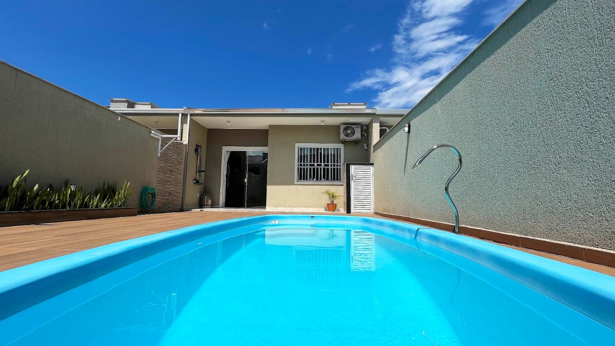 Casa com piscina privativa a 300m da praia! Aproveite Guaratuba com conforto e privacidade no bairro Eliane, próximo a mercado, padaria e farmácia. São 2 quartos (1 suíte) com ar-condicionado, sala com TV, Wi-Fi e 2 sofás. Cozinha completa com fogão, micro-ondas, forno elétrico, geladeira e utensílios. Área externa com piscina, churrasqueira e mesa para refeições. Perfeita para famílias e grupos que buscam dias tranquilos perto do mar.