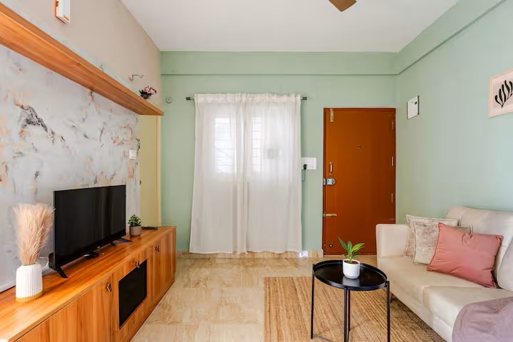 Welcome to our stylish, cozy 1BHK flat nestled in a serene residential area of Bangalore. Enjoy the tranquillity of this quiet retreat equipped with an AC for comfort in any weather. Stream seamlessly with up to 100mbps WiFi, and conveniently park your bike hassle-free. Savour complimentary tea and coffee as you unwind on premium mattresses dressed in quality linens. We've got you covered with provided shampoo and soap for a worry-free stay. Experience comfort and convenience at its best!
