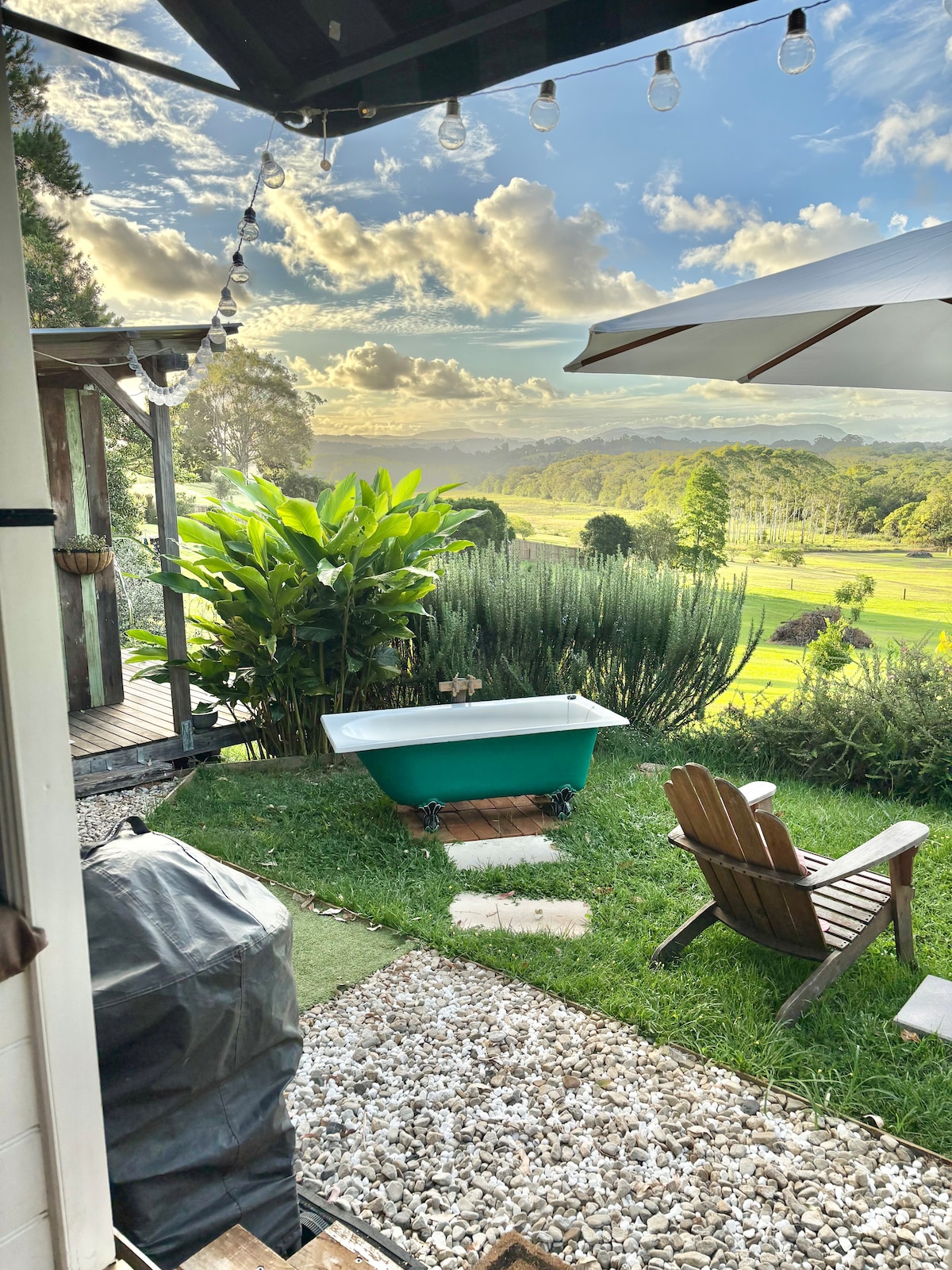 The Old Peach Farm Tiny House outdoor bath, views!