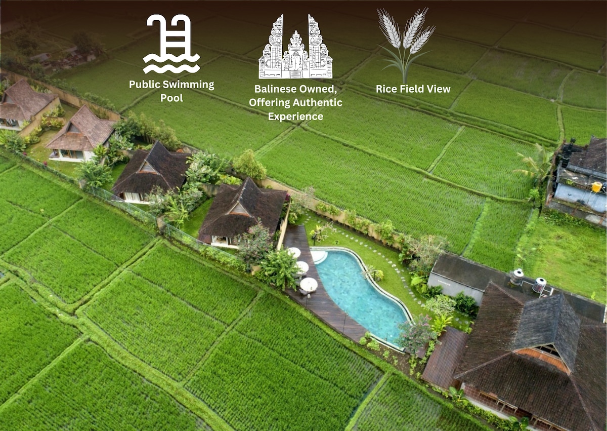 Lenyűgöző 100 éves 2024-ben felújított villa kiadó. Rizsföldekkel és kis falvakkal körülvéve 10 perc autóútra Ubudtól. Két nagy hálószoba gardróbbal és saját dzsungel fürdőszobával. 3 kingsize ágy új matraccal, amelyeket 2025-ben cseréltek ki. Nagy sebességű internet. Saját medence terasszal és kerttel. Nagy, nyitott konyha elektromos sütővel. Kerékpár- és kerékpárparkoló az ingatlan területén. A parkolás 400 méterre van a főúton ingyenesen. Az ingatlan csak motorkerékpáron vagy gyalogosan érhető el.