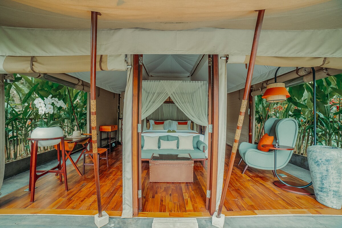 A 20. század elején a ragyogó afrikai szafarikra emlékeztető két sátoros villánk elegáns és romantikus légkört biztosít, amely lehetővé teszi, hogy kényelmesen megtapasztald a környező trópusi erdőt. A sátor egy tágas, 45 m2-es, boltíves mennyezettel, és egy szomszédos, félig szabadtéri fürdőszobával és terasszal rendelkezik. Ébredj fel a madárdalok szimfóniájára és a majmok alkalmi látványára a fák tetején. Később vegyél részt egy víztisztító szertartáson a falunk szent vízforrásain.