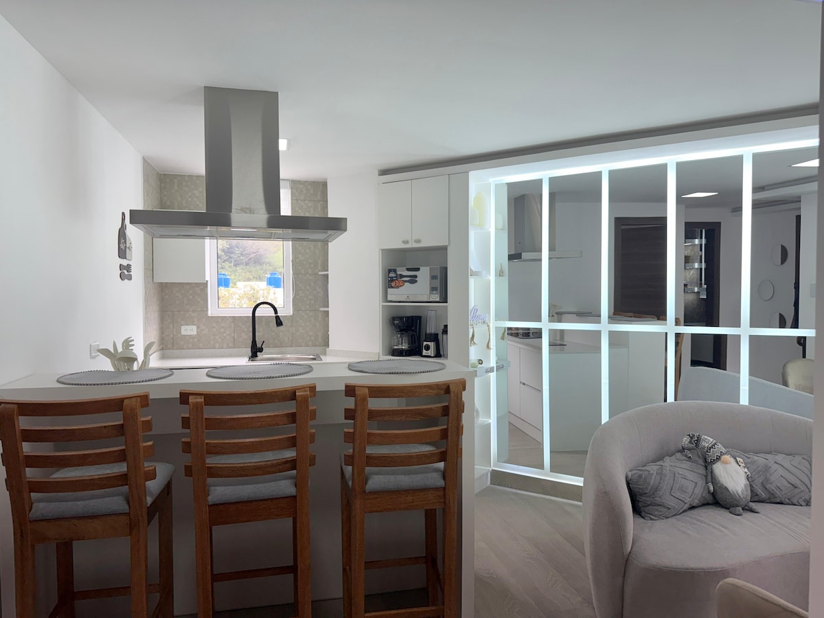 Es un lugar acogedor, con todos los servicios que puedas necesitar. Es perfecto para el fin de semana, esas dos noches que necesitas salir de tu rutina, es excelente para parejas. Agua caliente en la ducha, WiFi, cocina, nevera, licuadora y microondas.
