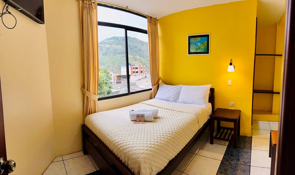Habitacion # 2 , 1 cama matrimonial de 2 plazas , Baño Privado , Agua Caliente , Wifi, Garaje, áreas comunes – jardines , sala, terraza con vista al Volcán Tungurahua, a la ciudad de Baños y a las montañas . Estamos ubicados a 7 minutos caminando del centro de la ciudad, piscinas termales de El Salado , Zoológico , Acuario, etc. Servicio de Transporte desde Aeropuertos y todo el Ecuador, taxi 24 Horas .Servicio de Lavanderia (Laundry)