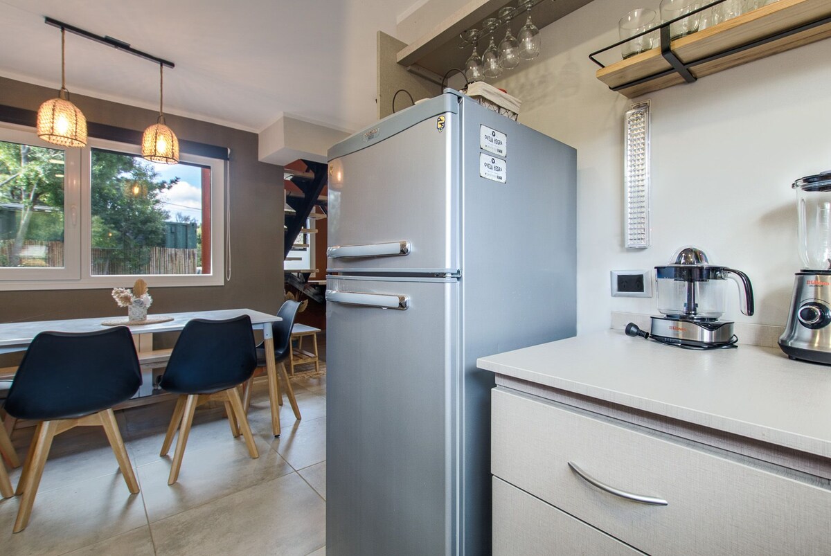 Víkendház gyalog Cerro Piltriquitrónból. A csendes lakóövezetben található meleg víkendház a modern dizájnt a hegy bájával ötvözi. A természettel körülvett és a Piltri-re nyíló egyedi kilátással ideális egyensúlyt teremt a kényelem és a nyugalom között. Felszerelt konyhával, Wi-Fi-vel, fűtéssel, grillezővel és tágas kerttel rendelkezik, hogy élvezhesd a természetet. El Bolsón központjától néhány percre található, ideális hely a pihenéshez és a környezet felfedezéséhez. Minden típusú járműhöz megfelelő.
