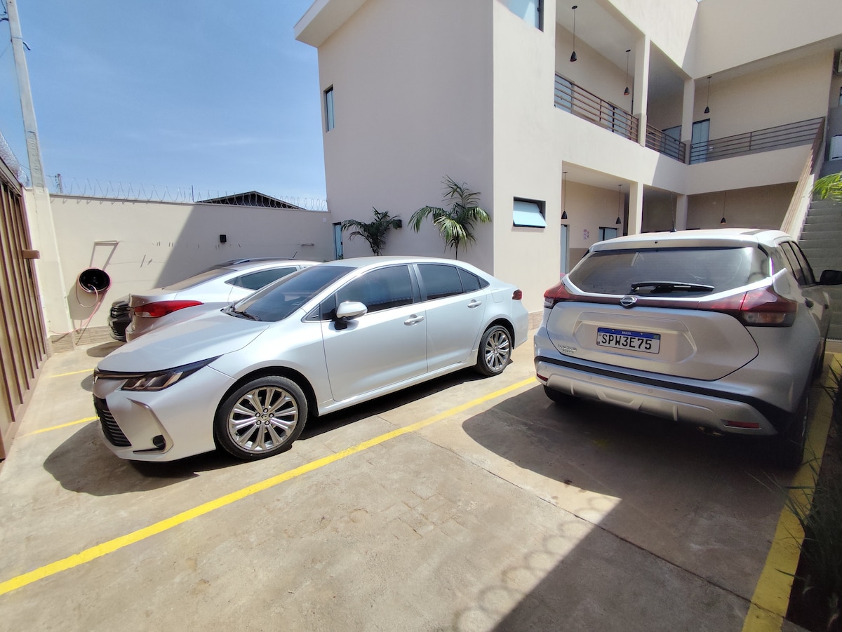 Ap fica a menos de 1km do hospital do amor, 3km do shopping de Barretos e a 14km do parque do peão com acesso rápido pela rodovia à 15 minutos de carro. O apartamento é novo sendo uma suíte com cama de casal e guarda roupa planejado e outro quarto com 2 camas de solteiro e comoda. Todos os quartos possuem ar condicionado. A garagem contempla 1 Vaga. Possui eletrodomésticos, utensilios de cozinha, máquina de lavar, tv, geladeira, microondas e coktop. A internet é de alta velocidade.