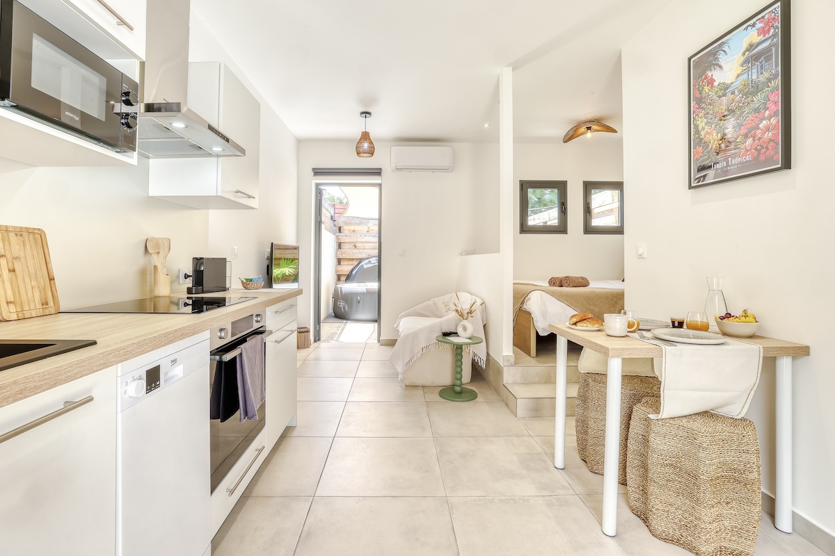 Spacieux studio chic et bohème au style tropical attenant à notre maison possède son entrée indépendante. Climatisé, équipé d'un lit en 160, d'une salle de bain avec douche à l’italienne, d'une cuisine équipée, d'une terrasse privative et d'une place de parking sécurisée pour une voiture. Accès à la piscine en pierre naturelle dans un cadre paisible végétalisé. Notre chienne Labrador, douce et sociable, vit sur place. Idéal pour un séjour détente en couple ou en solo.