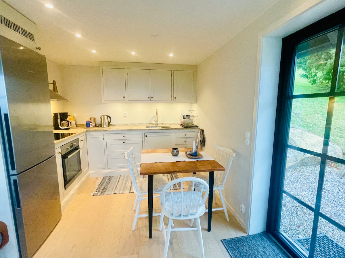 Szabadon álló vendégház terasszal, kerti bútorokkal és grillel. A teljes szálláshely kb. 50 négyzetméter. A nappali, a konyha és a 2 fős hálószoba egy helyiségben található. A konyhában tűzhely sütővel, hűtőszekrény/fagyasztó, kávéfőző. WC zuhanyzóval és mosógéppel. A vendégház egy családi ház kertjében található, egy festői helyen, közel a központi és a tengerhez. A közelben számos túra- és kerékpárút található. Sok gyönyörű hely vár felfedezésre. Lotta és Lars-Åke üdvözöljük Önöket.