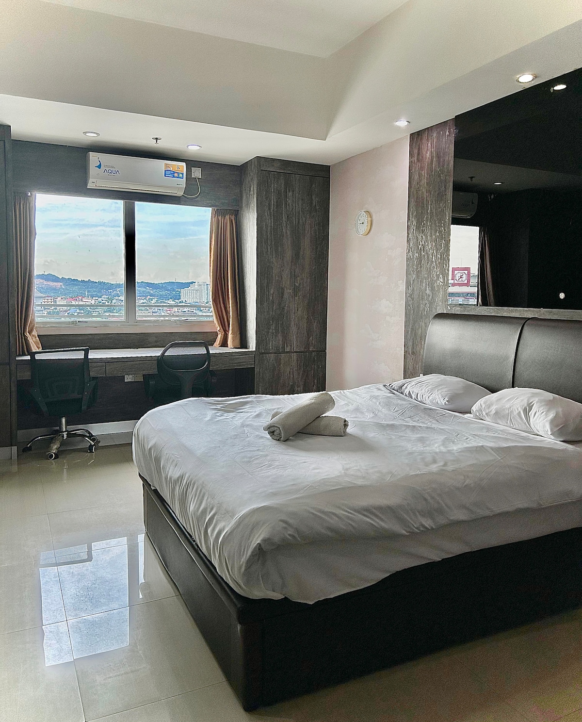 Two bedrooms new apartment in the central city area with a beautiful view facing the sea and the city. Five min distance to Batam Centre international ferry terminal, less than 30 min to the airport, with a shopping mall on the ground floor and few other nearby shopping malls, walking distance to the Fanindo Sanctuary food (KFC, MCD, Starbuck, Burger king, Jco)