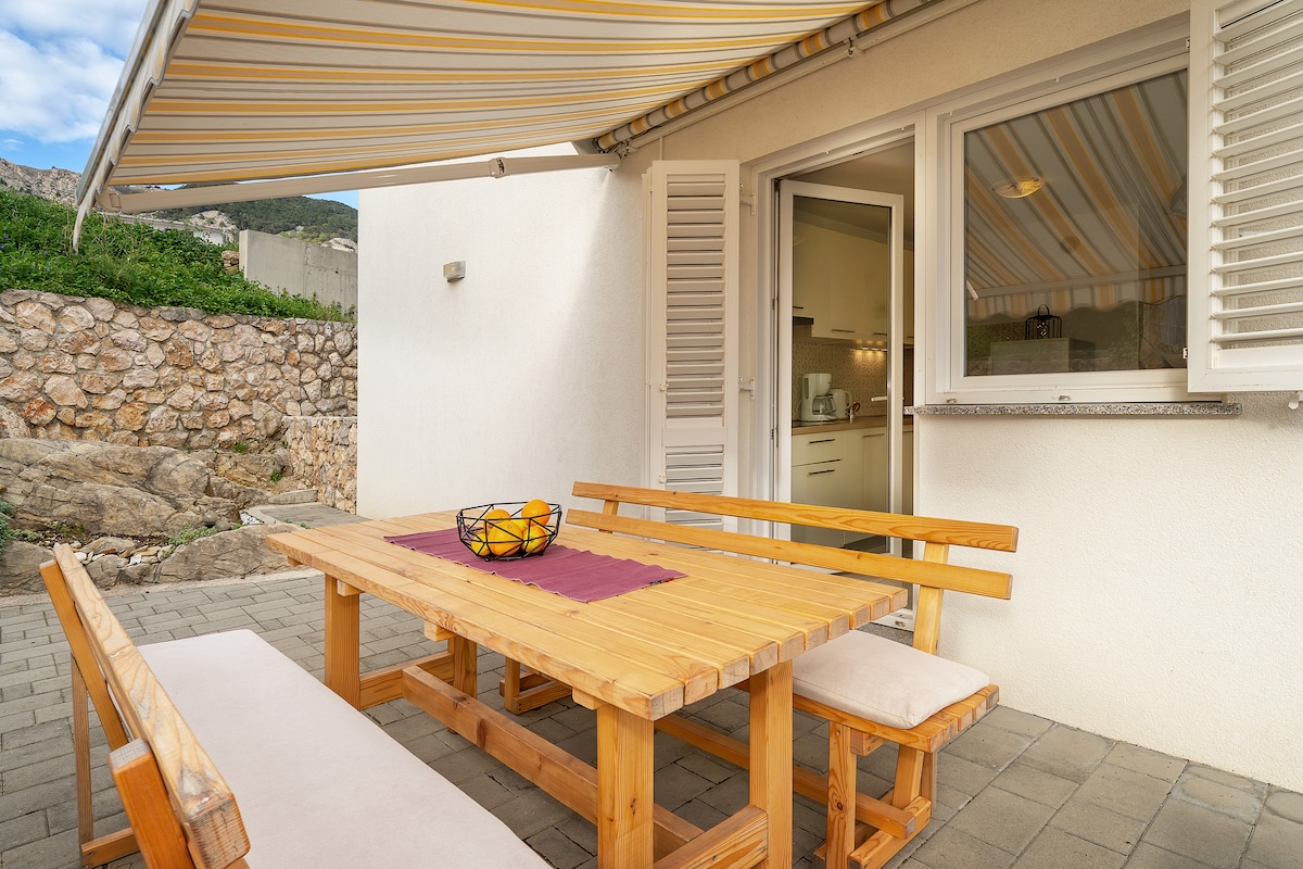 Az apartman (40 $) az 1. szinten található, 1 kétszemélyes szobával, nappalival, konyhával, extra ággyal (kanapé) a nappaliban, fürdőszobával, nagyon nagy terasszal, kilátással a tengerre, szatellit tv-vel, ingyenes wifivel, légkondicionálóval, fűtéssel, parkolóhellyel rendelkezik. A ház 200 méterre található a kavicsos strandtól és a városközponttól.