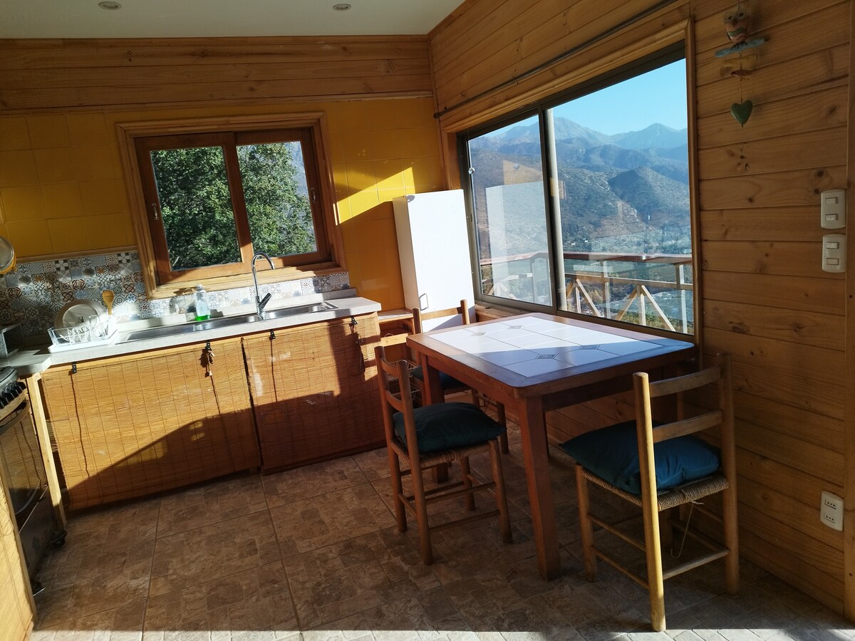 See El Arca Naranja, Ecologic Cabin too! Cabaña for 2 people, 20 min from Santiago, surrunded by montains, trees and wild life. Kitchen all equipped, gaz stove for cooking, little oven, fridge, inside bathroom, hot shower and fireplace. Trekking routes, street and mountain bike, little river to swim, gardens with aromatic plants and spices, hammock, barbecue grill, near ski centers and mountains landscape, local handcraft. Available week and week end Discount for longer stay