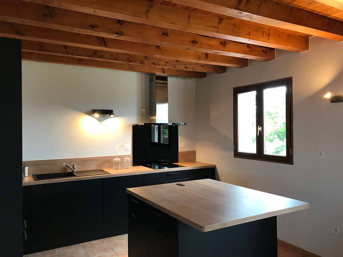 Superbe chalet spacieux et lumineux de 80 m2 neuf , construit et décoré par nos propres mains, situé à l'orée du bois sur le terrain de notre habitation principale mais complétement indépendant. Vous profiterez de 2 terrasses extérieures , dont une perchée dans le bois pour un moment cocooning avec son spa privatif. Ce logement affiche un style insolite et tout confort , dans un cadre unique propice à la détente. Possibilité d’arriver à 17h le WE.