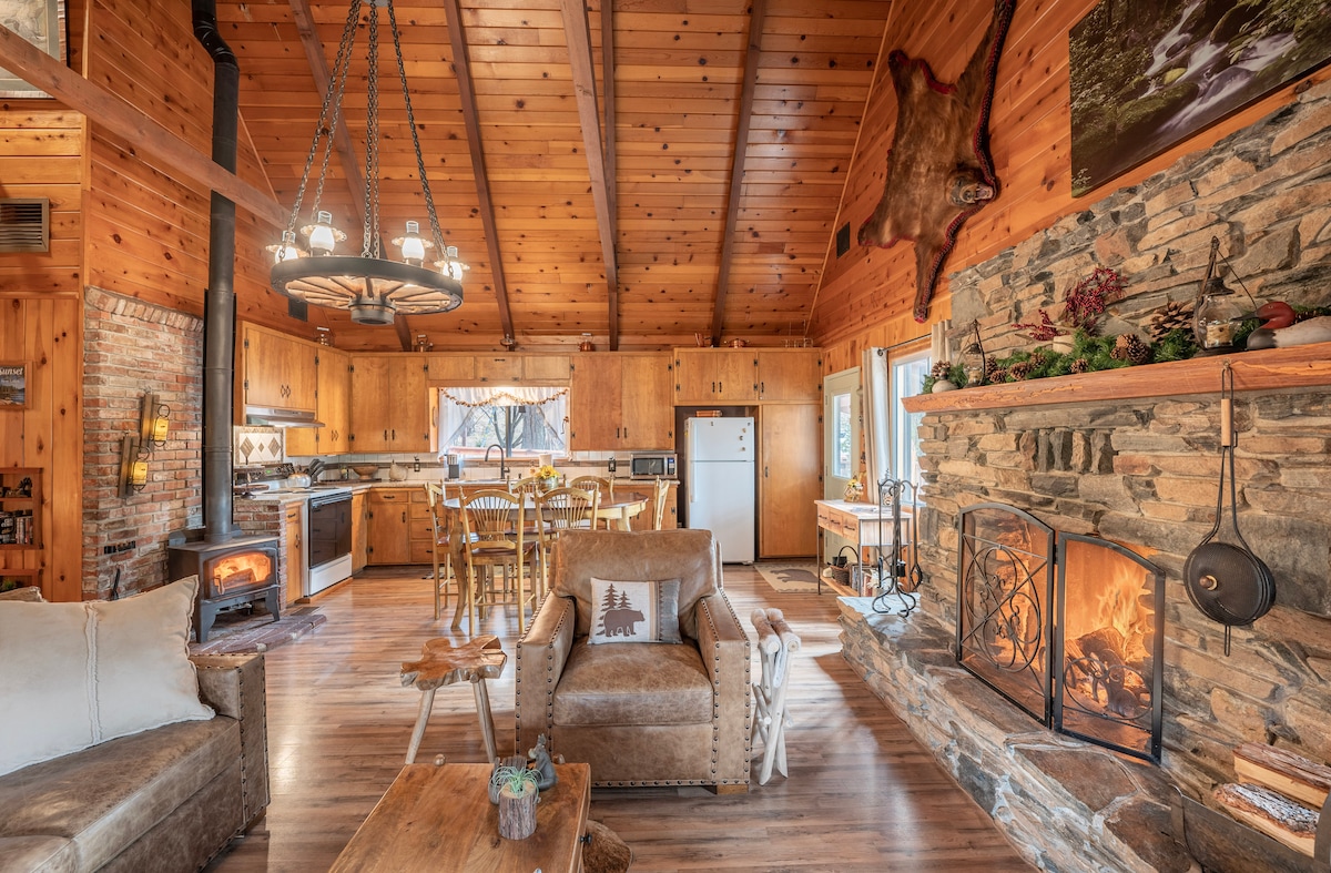 Mountain Meadow Cabin is a charming all cedar cabin with modern amenities. Bask in the ambiance of the gorgeous open stone fireplace. Play cards or boardgames by the light of the fire and/or the grand wagon wheel chandelier. Enjoy the wrap around deck, watch the wildlife roam through, and tell stories by the outdoor chiminea year round! Swim, fish, kayak, and paddle board in the pond, hike Lewis Trail, and explore Yosemite, then relax in the bubbling hot tub! MMC….YOUR vacation destination!