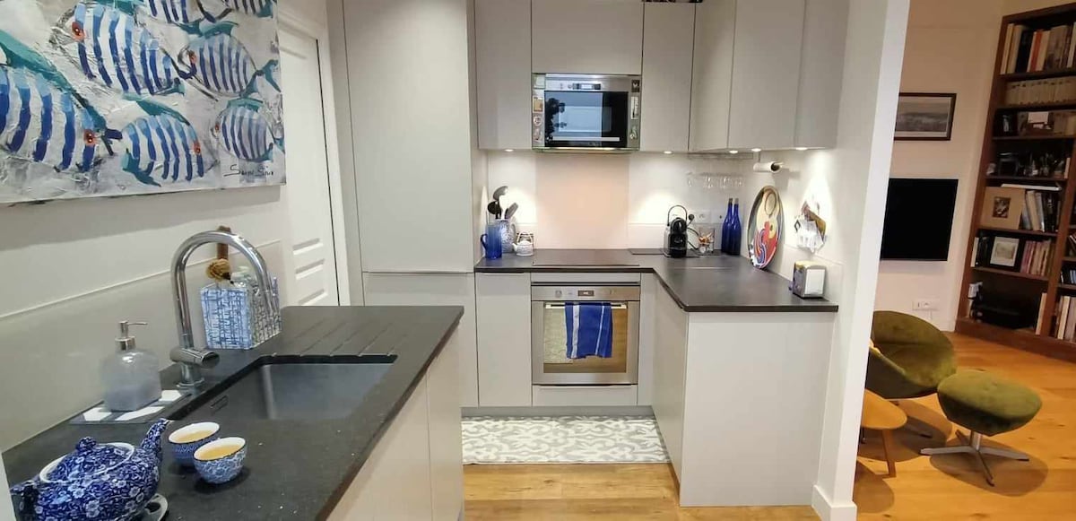 Szeretnélek üdvözölni ebben a bájos, nagyon világos lakásban, amely 10 perc sétára található az Eiffel-toronytól, a Champs de Marstól, a Szajna partjaitól, 5 percre Beaugrenelle központjától és 3 percre a 10-es és M8-as metrótól, 10 percre az M6-os busztól a közelben. Van egy hálószoba franciaággyal és egy nappali kanapéval A konyha fel van szerelve egy szigettel az étkezésekhez. A fürdőszobában nagy zuhanyzó, mosdó és külön vécé található Hely a munkavégzéshez + nagy sebességű Wi-Fi