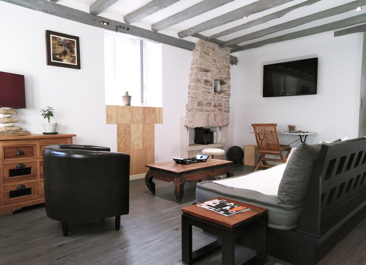 Charming Stone House with an enclosed, private garden, located in Beaune, between the Hospices de Beaune and the Vineyards. 1885 Built Stone House Renovated with fine taste in 2019. Dine by the fireplace, lunch in the garden, ideal position less than 10 minutes walk from the city center. Bike rental and grocery store around the corner. 2 wheels welcome in the garden. Design. Kingsize Bed. Quality linens. Equipped Kitchen, BBQ, Deckchairs. Washer. Dryer. Free Street Parking.
