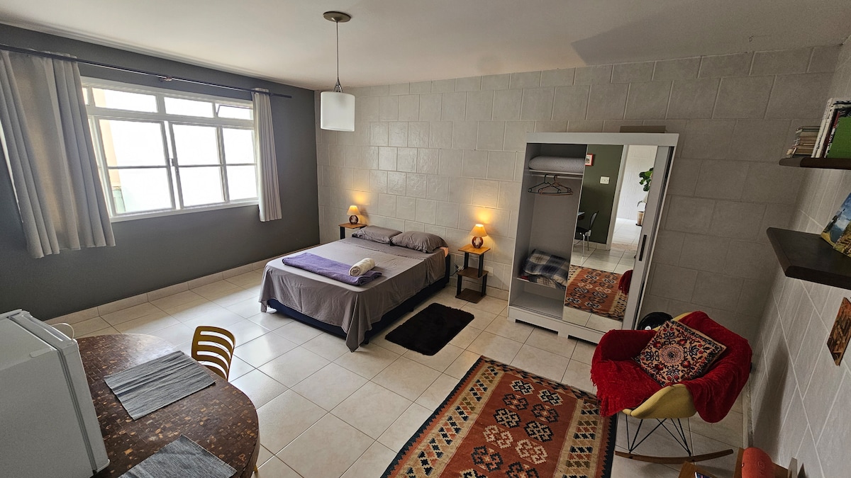 A Jardim Paulista negyedben vagyunk, az Ibirapuera Park és a Gimnázium mellett. A 45m2-es stúdióban franciaágy és kanapéágy, fürdőszoba, kis konyha, étkezőasztal és légkondicionáló található. Szükség esetén a kanapéágy mellett biztosítunk egy extra matracot is. Ingatlanunk három közös bejárattal rendelkező házra oszlik. Tekintsd meg a hely leírását, hogy megismerhesd az infónkat. A környezetünk ismerős, nem adunk ki bulikat. Olvasd el az utolsó vendégek által írt véleményeket