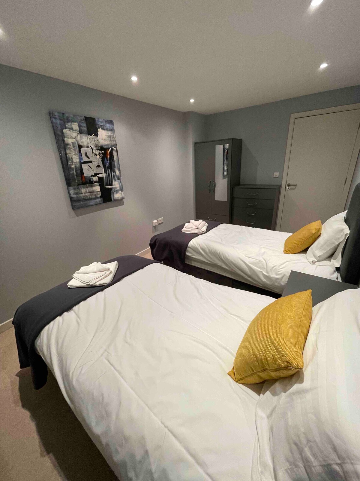 Modern 2 ágyas lakás Bedford központi helyén - pár lépésre az Embankmenttől, a városközponttól, a Bedford Blues Rugby Clubtól és a Bedford Hospitaltól. Tökéletes alvállalkozóknak, szakembereknek, áthelyezőknek és a Universal Studios csapatának. Egyszerű hozzáférés a Bedford vasútállomáshoz és az A6-hoz. Szupergyors Wi-Fi, 50” Smart TV, kávéfőző, teljes konyha, törölközők, ágynemű, szappan. Zárt parkoló, lift, csengő. Csendes, stílusos és biztonságos. Vezető 21 évfeletti vendég. Minden 18 évfeletti vendégnek érvényes fényképes személyazonosító okmánnyal kell rendelkeznie.