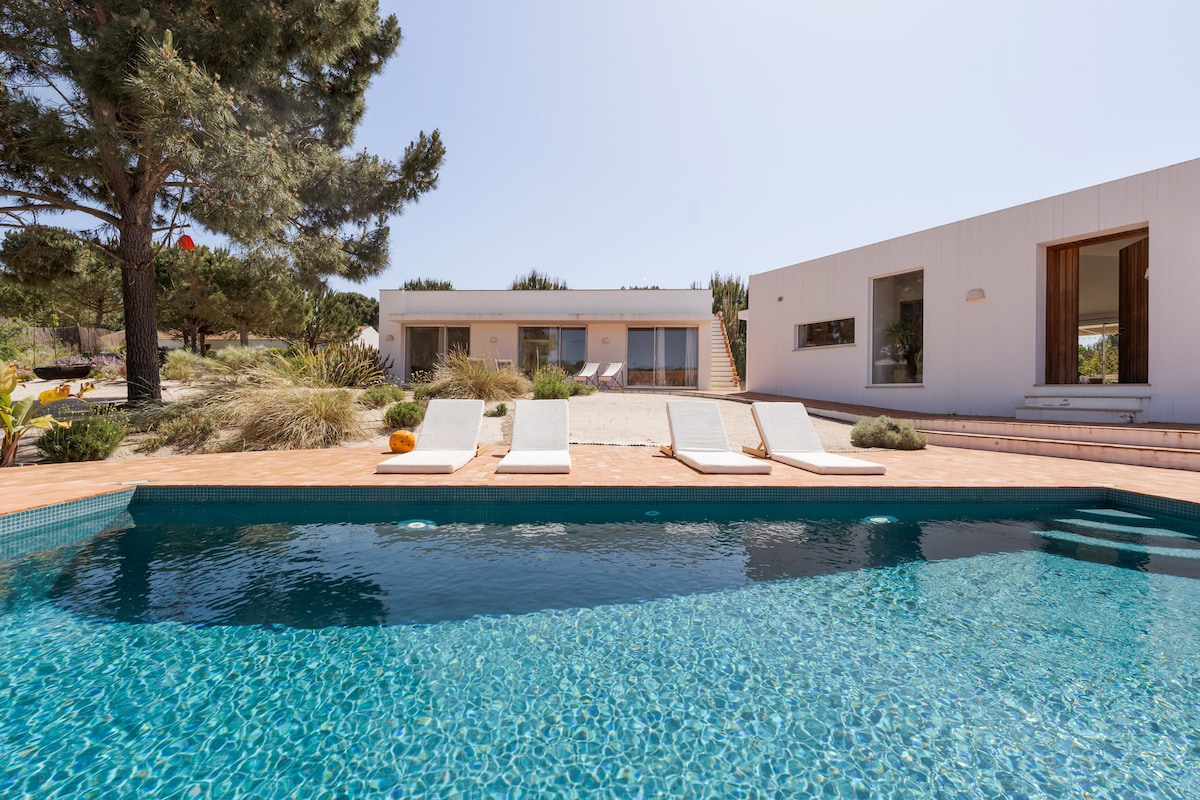 This charming house is set in Casas da Encosta in Pego, just 2 to 3min driving to Pego and Carvalhal beaches. The house has 2 buildings, one with the master bedroom, a big living room, kitchen and dinning area, with access to the exterior lounge area. The second building has 2 double ensuite bedrooms on the edges and in the middle a living room and small open kitchen. The house has a big and pleasant exterior areas and pool, with a baby sand garden.
