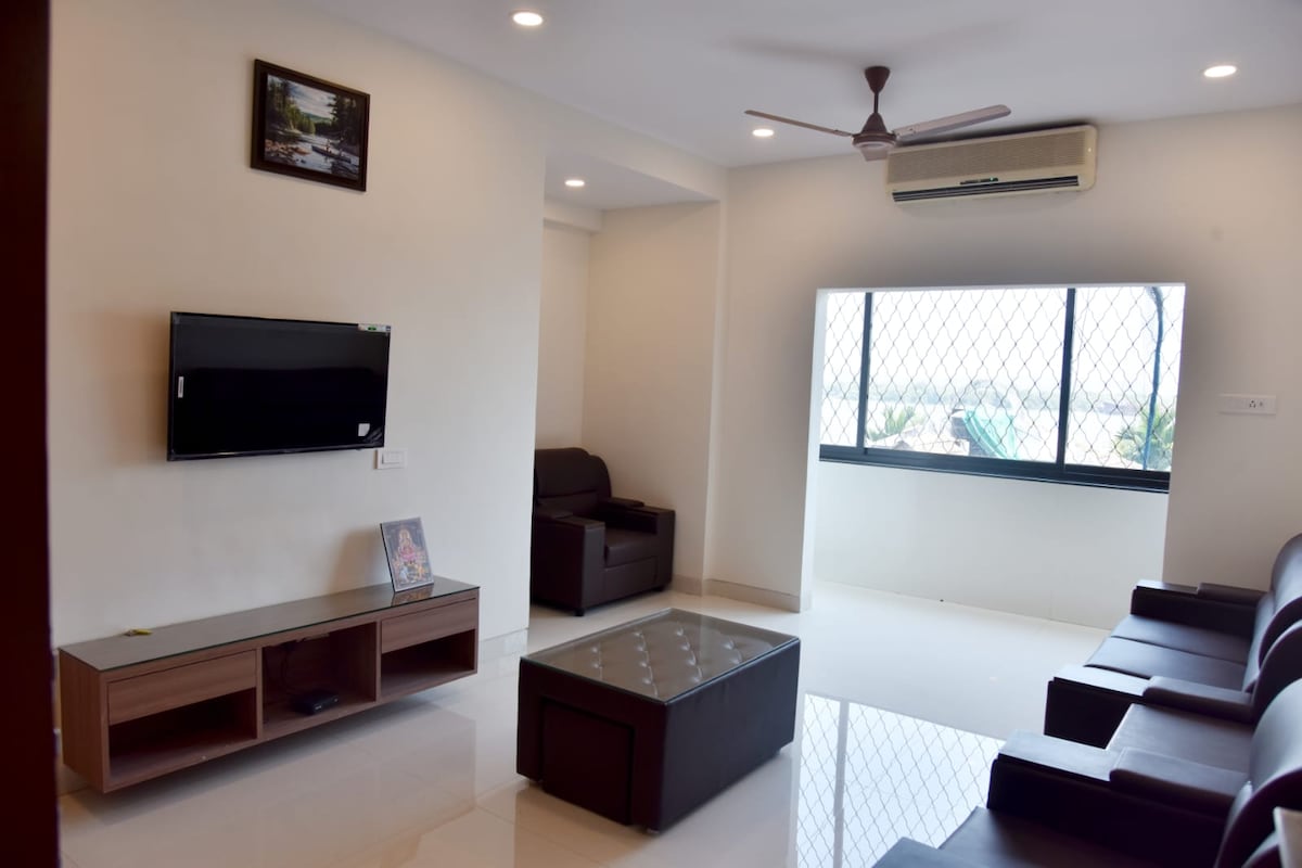 Features & Amenities: - Wi-Fi, Geysers in bathrooms with western commode - Oven, Refrigerator, TV, Washing Machine, Water filter, Chimney and Gas Stove - Kitchen utensils - 24-hour water - Open car parking space, Lift access and CCTV surveillance -AC usage extra charges applicable Location Highlights: Nestled in a serene locality surrounded by greenery, the apartment offers a calm and refreshing environment. Each room comes with a balcony, ensuring excellent ventilation and natural light.
