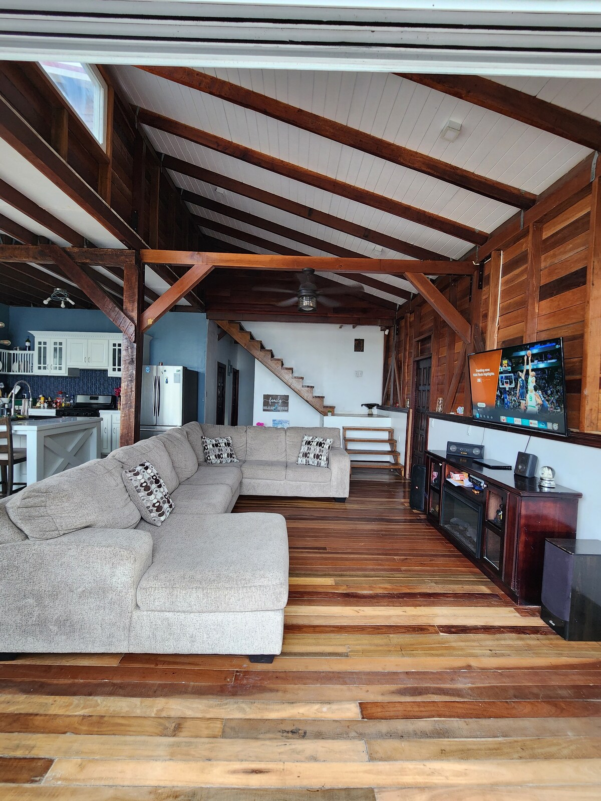 This house is GOLD STANDARD CERTIFIED by the Belize Tourism Board. Registered under the name Kane Villas. Includes: - Two level house - 1 bedroom with king bed - Upstairs loft with queen bed and bunk beds - Full kitchen: stove, oven, coffee machine, fridge, toaster - Fully screened in living area w/couch - Large deck w/outdoor furniture - BBQ grill - Outdoor fireplace on deck - Hot water throughout house - High speed WiFi - 50” Smart TV with Netflix Property includes shared swimming pool