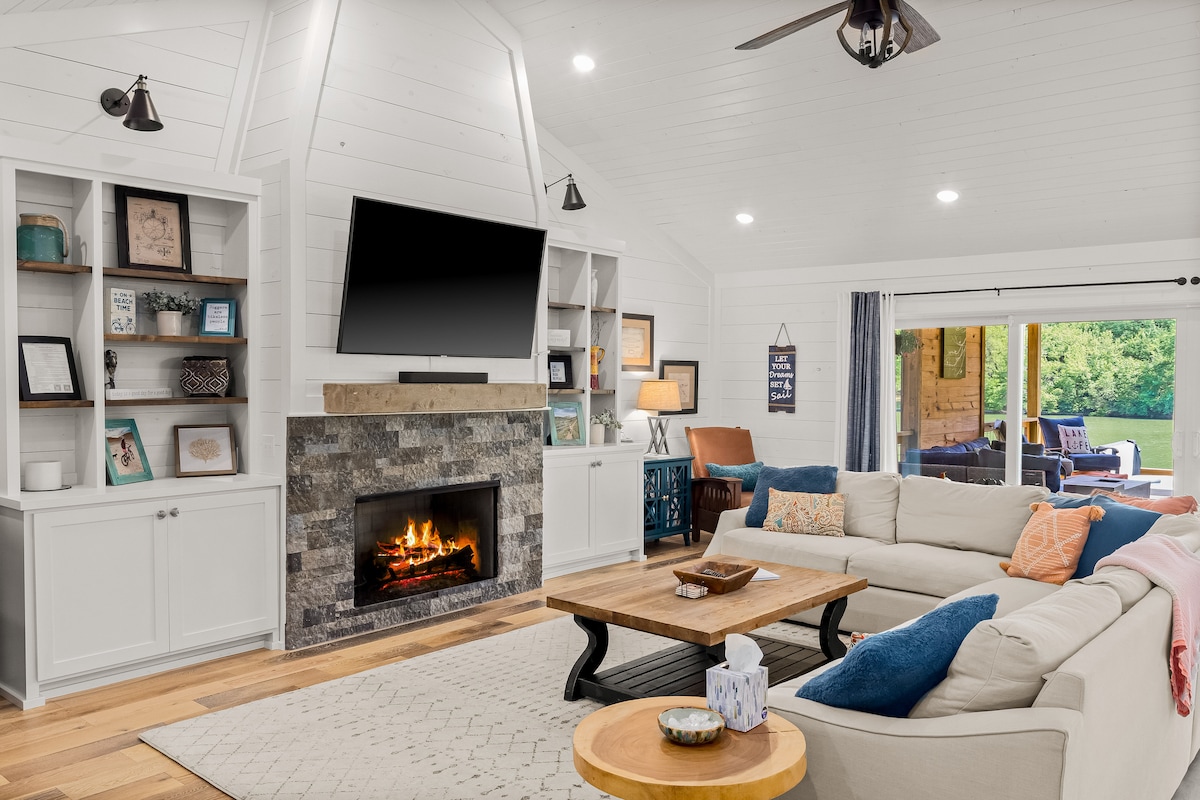 This home was built from salvaged timbers from the local area.Home has tall open ceiling and a timber staircase to the balcony,custom oak floors(also made from salvage timber)Master bed is complete with a master bath with huge rock shower that was made from local creek stones .Up stairs has king bed,120"movie theater, extra seating. Full length back porch leads to the hot tub. It truly is one of a kind