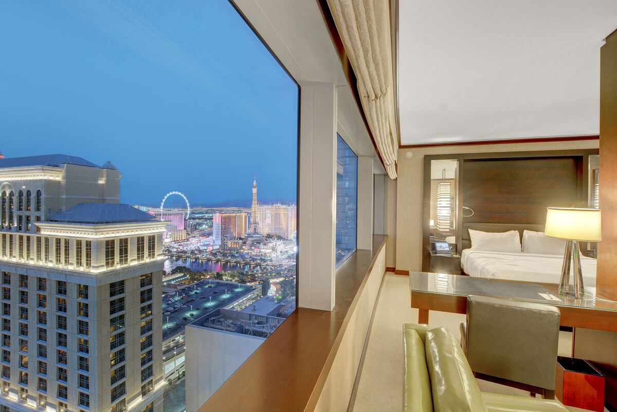 Ingyenes parkolási lehetőség van, és nincs üdülőhelyi díj! Vdara a City Centerben, a Las Vegas Strip szívében. Ez az egy hálószobás társasházi lakás az 56. emelet legfelső emeletén található, kilátással a Bellagio szökőkutakra, és egészen a Stratig. A társasházi lakásban legfeljebb 4 vendég fér el egy king méretű ággyal és egy teljes méretű kihúzható kanapéval. Könnyen megközelíthető a Bellagio, a Cosmopolitan és az Aria. Közel van a TMobile Arena, a Park Theatre, a Crystals Shopping és a City Center Tram.