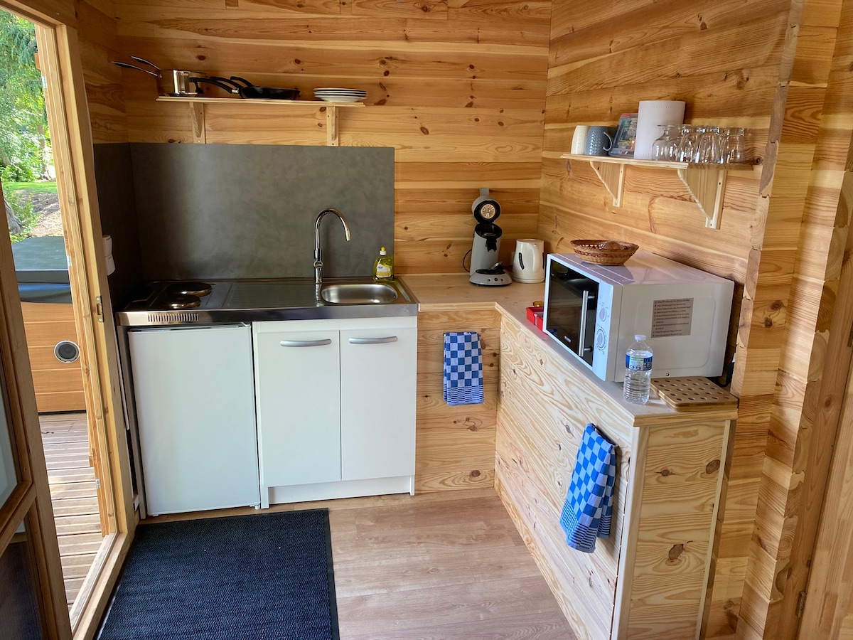 Vízparti faház szabadtéri pezsgőfürdővel